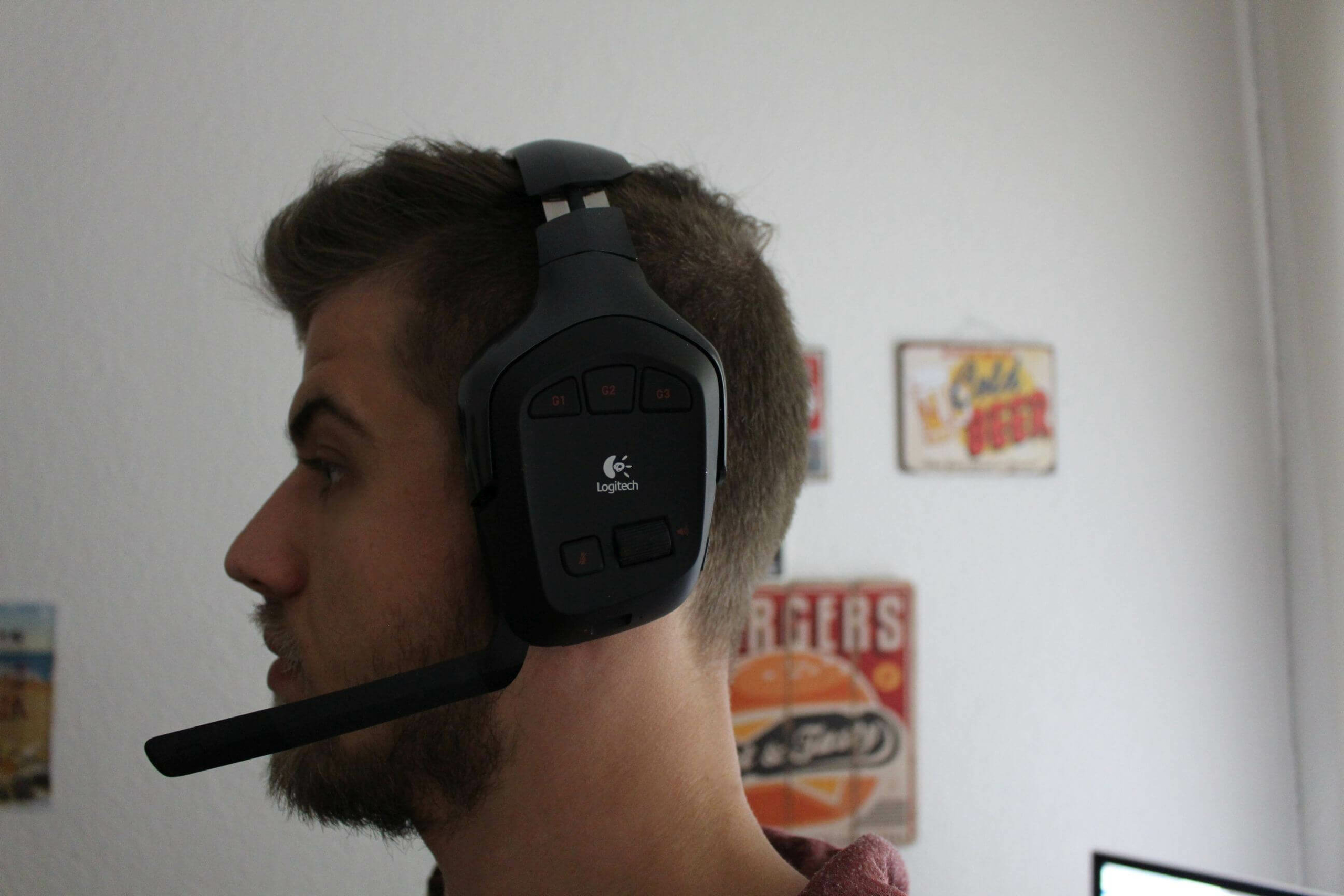 Meine Meinung zum Tragekomfort basiert auf über 200 Stunden Tragezeit. Mit einem etwas großen Kopfumfang (rund 59 cm), gehöre ich eigentlich zu den Leuten, die Probleme haben passende Headsets oder generell Kopfbedeckungen zu finden. Selbstverständlich lässt sich das G930 wie alle üblichen Headsets in der Länge verstellen. Mit einer passenden Länge sitzt das G930 problemlos auf dem Kopf und drückt auch nach längerem Tragen nicht störend. Dabei habe ich bereits auch Sitzungen von rund 10-12 Stunden am Stück mit dem Headsets hinter mir. Man setzt es zwar nach paar Stunden auch mal ab, was aber nicht wegen schlechtem Tragekomfort zusammenhängt, sondern einfach mit der Tatsache, dass man auch mal eine kleine Pause machen sollte. Da dem Headset ein Kabel fehlt, nimmt man es seltener ab als ein typisches kabelgebundenes Headset. Umso erfreulicher, dass es so problemlos zu tragen ist. Bei kleineren Köpfen, die eher dem Durchschnitt entsprechen, sollte das ganze sowieso problemlos klappen.